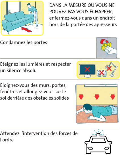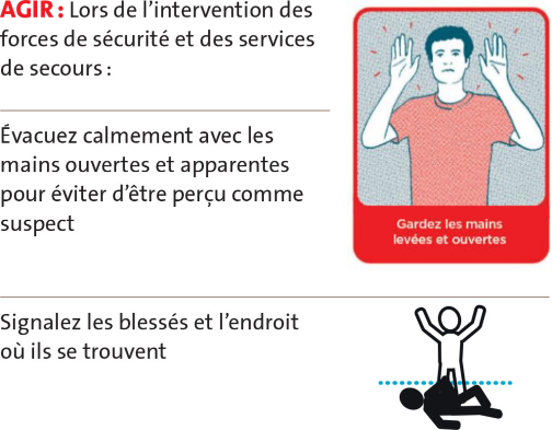 • Évacuez calmement avec les mains ouvertes et apparentes pour éviter d’être perçu comme suspect