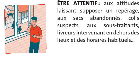 • ÊTRE ATTENTIF : aux attitudes laissant supposer un repérage, aux sacs abandonnés, colis suspects, aux sous-traitants, livreurs intervenant en dehors des lieux et des horaires habituels…