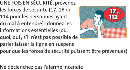 • UNE FOIS EN SÉCURITÉ, prévenez les forces de sécurité (17, 18 ou 114 pour les personnes ayant du mal à entendre) : donnez les informations essentielles (où, quoi, qui ; s’il n’est pas possible de parler laisser la ligne en suspens pour que les forces de sécurité puissent être prévenues)