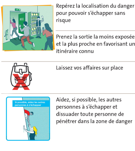• Aidez, si possible, les autres personnes à s’échapper et dissuader toute personne de pénétrer dans la zone de danger