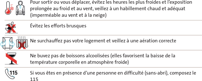• Pour sortir ou vous déplacer, évitez les heures les plus froides et l’exposition prolongée au froid et au vent, veillez à un habillement chaud et adéquat (imperméable au vent et à la neige)