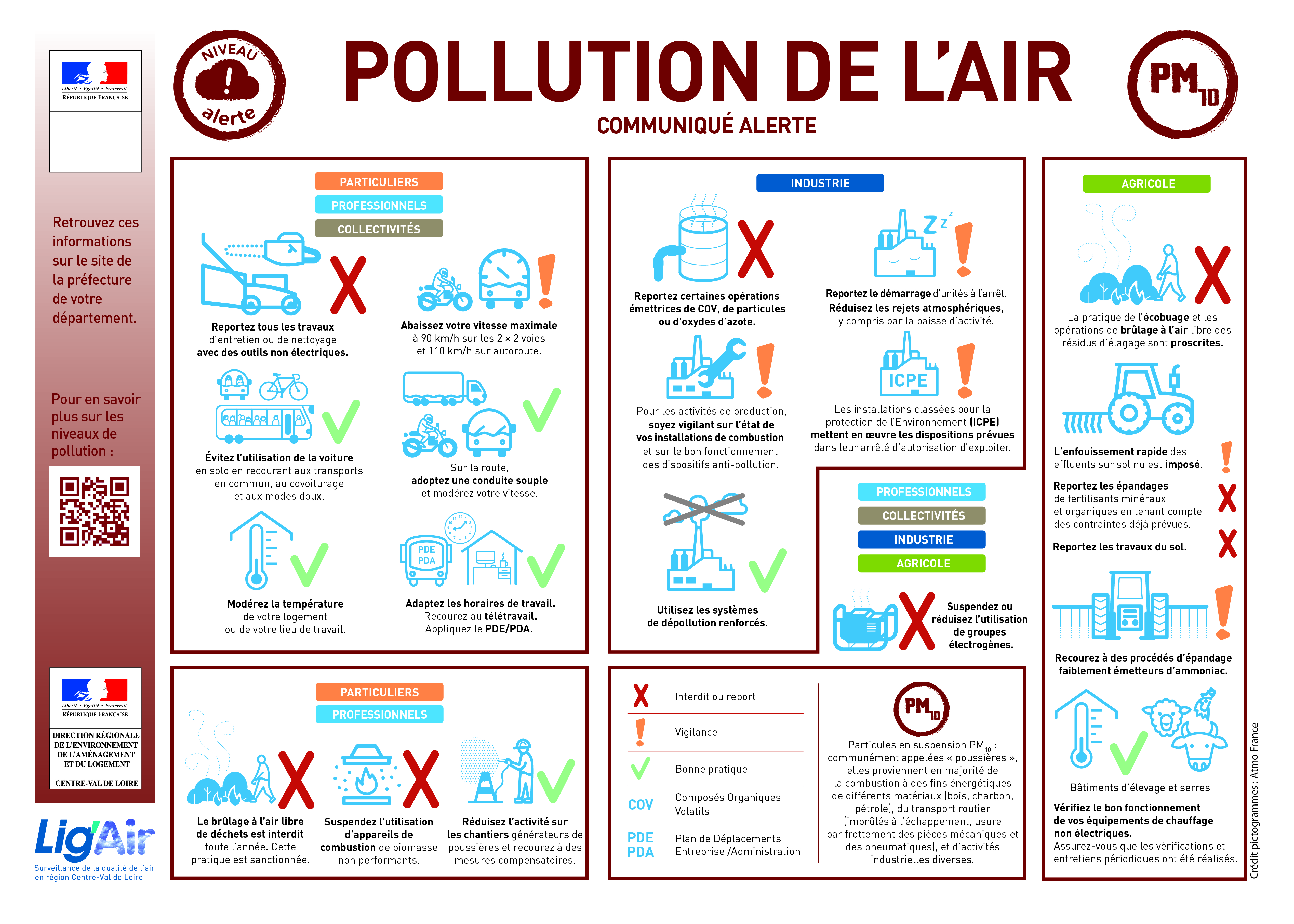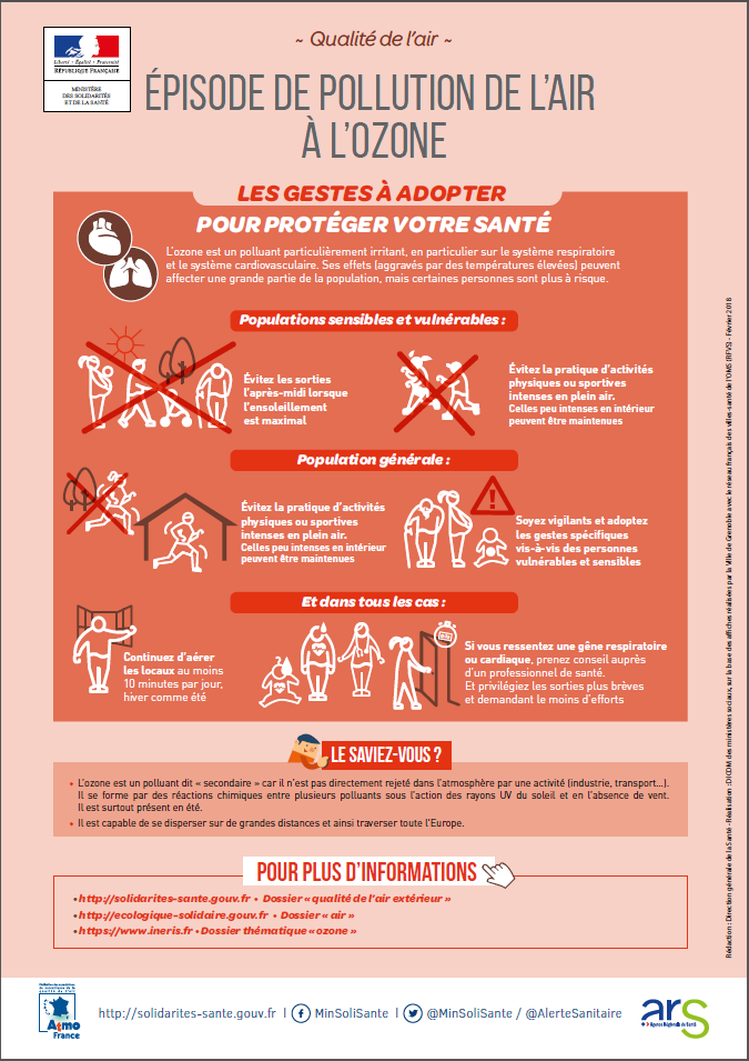 Au niveau local, le dépassement, ou le risque de dépassement, de l’un de ces seuils conduit au déclenchement de procédures préfectorales qui conduisent à la mise en œuvre de diverses mesures. Une de ces mesures est la diffusion des recommandations sanitaires définies par le ministère chargé de la santé, afin de protéger la santé des populations et en particulier des personnes sensibles ou vulnérables.