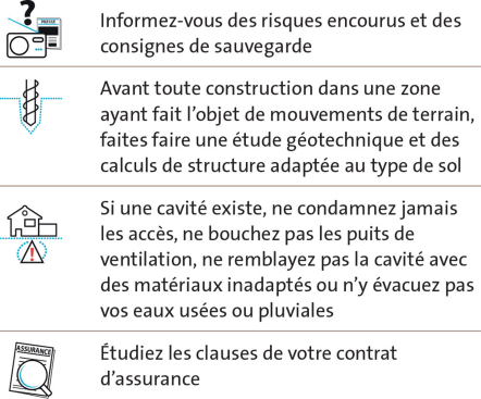 • Si une cavité existe, ne condamnez jamais les accès, ne bouchez pas les puits de ventilation, ne remblayez pas la cavité avec des matériaux inadaptés ou n’y évacuez pas vos eaux usées ou pluviales