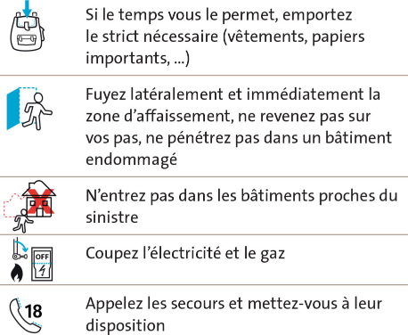 • Fuyez latéralement et immédiatement la zone d’affaissement, ne revenez pas sur vos pas, ne pénétrez pas dans un bâtiment endommagé